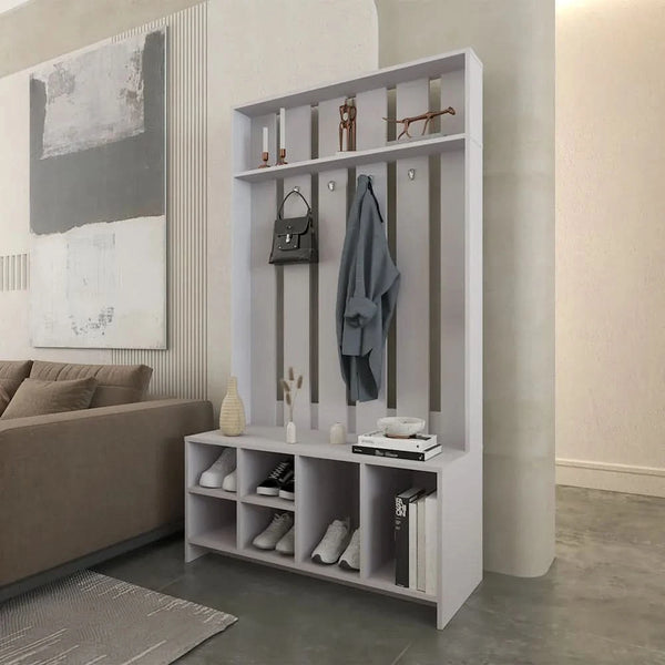 ON-TREND Wide Design Hall Tree with Storage and Bench, 4-IN-1 Multi-functional Entryway Bench with Coat Rack and Shoe Cubbies, Practical Furniture for Hallway, White(OLD SKU: SD000025AAK)