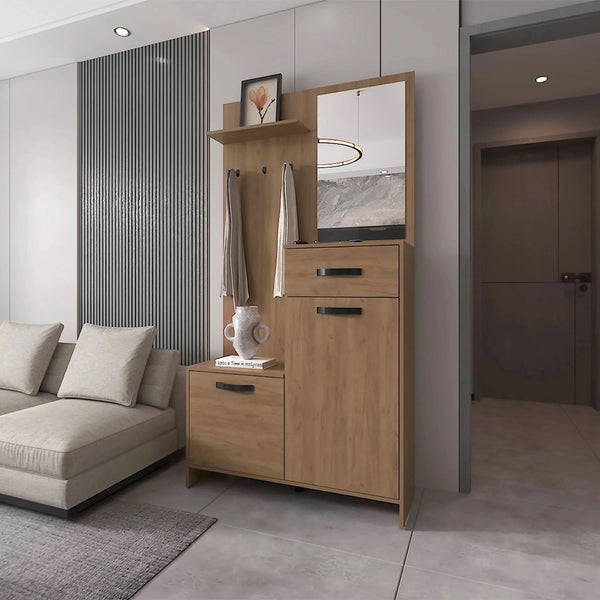 FM FURNITURE Elko Hall Tree Multistorage with a Mirror. Natural Oak