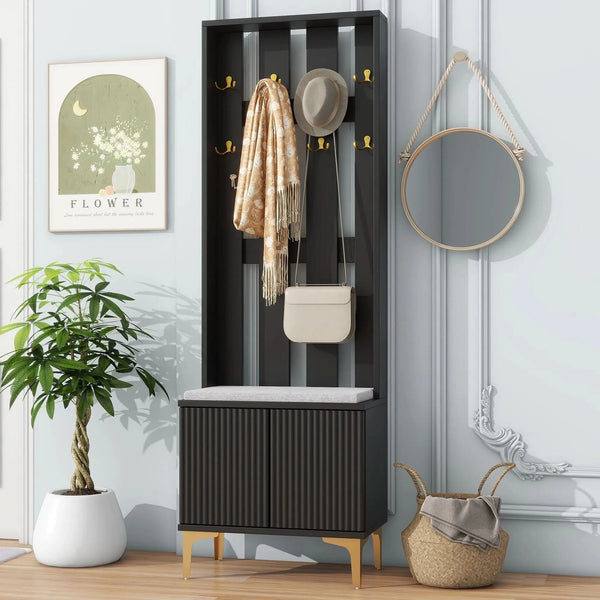 ON-TREND Modern Luxury 4-in-1 Hall Tree with Cushion, Versatile Coat Rack with 8 Gold Hooks and Legs, Entryway Bench with Adjustable Shelves & Fluted Doors for Hallway, Living Room, Black, 23.6'*70.8'